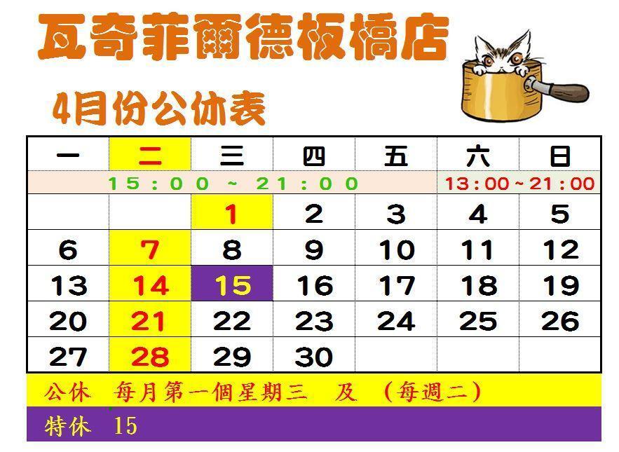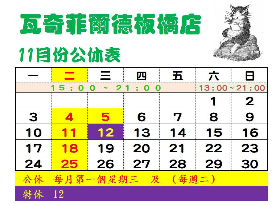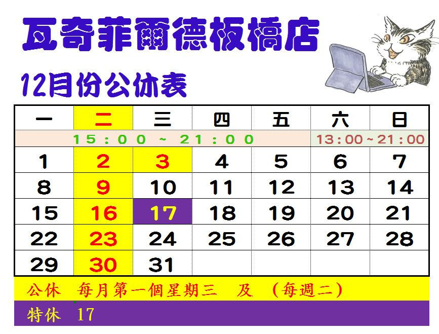 固定公休日 : 每月第一個星期三 及 每週二 (網店不公休, 天天可出貨)